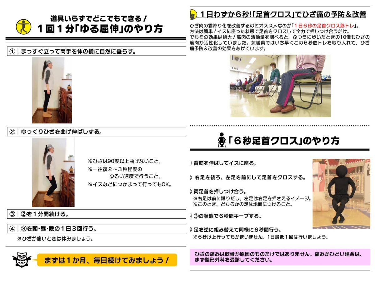 ちょうど6日夜のNHKのあしたが変わるトリセツショー「ひざ若返り」を見ました。キラキラは、番組おすすめのサイクリングで負荷が少ない膝の運動をしている方なのですが…10月中旬までサイクリングを殆どせずウォーキングしていましたが、これからはサイクリング中心に切り替えることにします。紹介された対策の「ゆる屈伸」1分1日3回、「足首クロス」6秒を交互1日1回は簡単で継続できそうなので早速本日からチャレンジすることにしました。