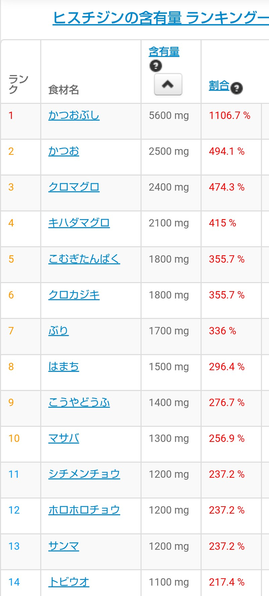 またヒスタミンの原因となるヒスチジンの含有量が多い食品にカツオ、マグロ、ブリ、ハマチなどキラキラがタタキや刺身をよく食べるものがあり、これでアレルギー反応が出ることもなく、直接の蕁麻疹の原因ではないですが、試しに1ヶ月控えめにしてみます。トホホ😂